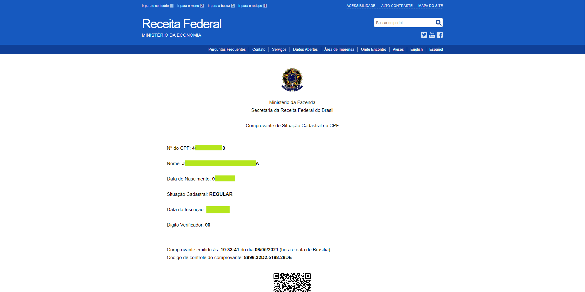 Abaixo segue um exemplo de uma Situação Cadastral do CPF de uma consulta feita.