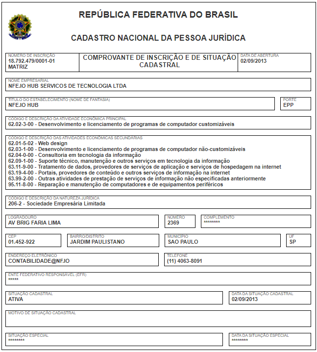 Abaixo segue um exemplo do cartão CNPJ de uma consulta feita.