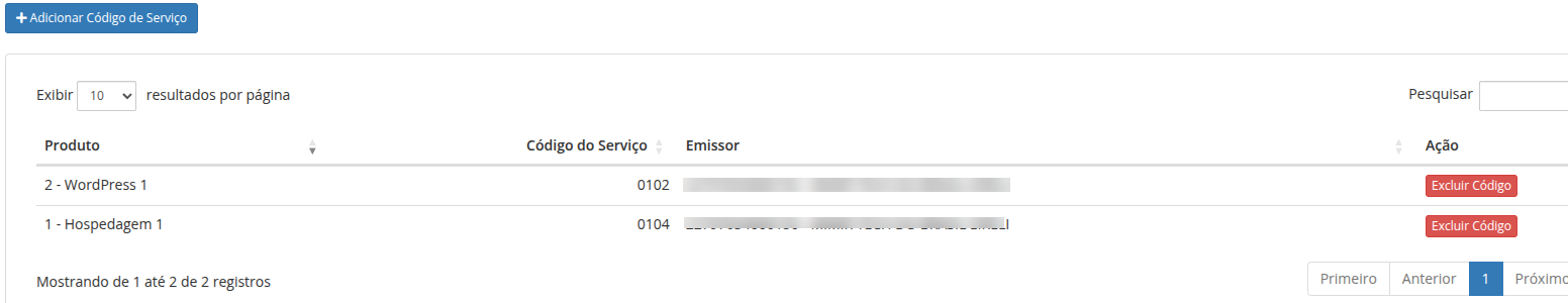 Para editar um código personalizado de um produto clique no botão Adicionar Código de Serviço e localize o produto/serviço desejado. Em seguida informe o novo código de serviço desejado e clique no botão Salvar Código.