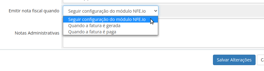 Configuração global para emissão das nots ficais pelo WHMCS, as opções disponíveis são.