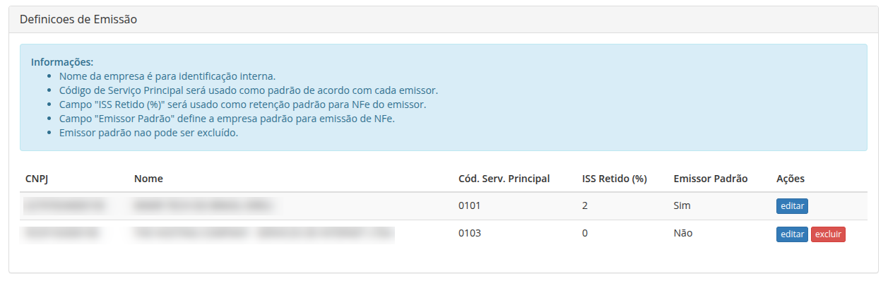 É possível configurar diferentes empresas a serem utilizados para emissão de notas fiscais pelo módulo, cada um com suas definições.