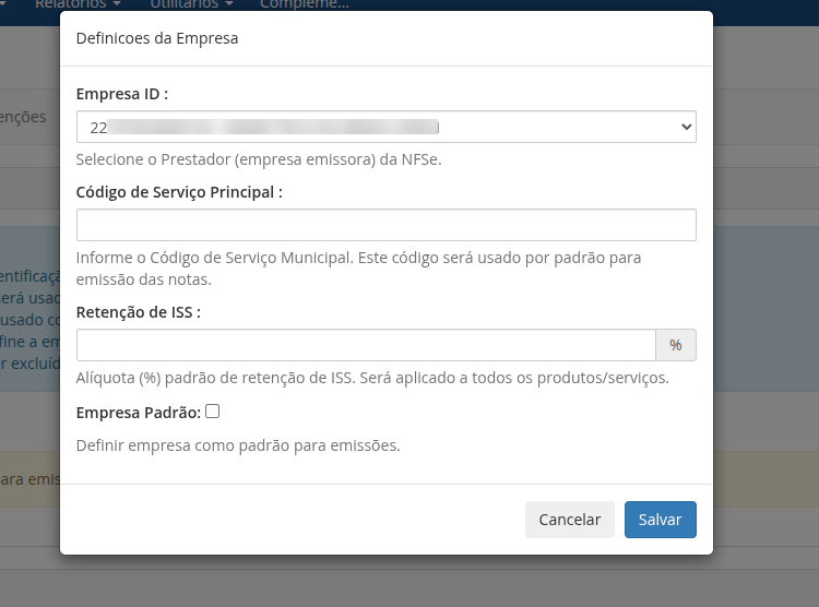 Marque esta opção para definir a empresa como padrão. A empresa padrão será utilizada para emissão de notas fiscais quando houver mais de uma empresa configurada. Caso haja apenas uma empresa configurada, a mesma será utilizada como padrão.