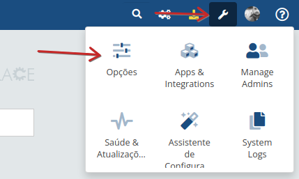 Para ativar o módulo adicional no WHMCS vá até o ícone de chave no canto superior direito e clique em Opções.