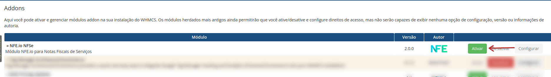 Localize o módulo addon NFE.io NFSe e clique no botão Ativar.