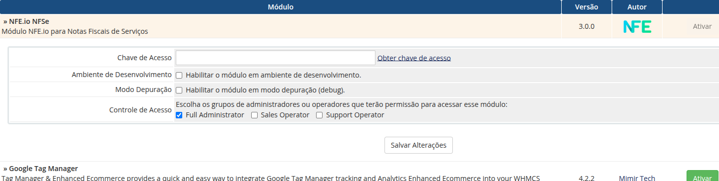 Após realizar o carregamento dos arquivos do módulo, ele está disponível para ativação e configuração no WHMCS.